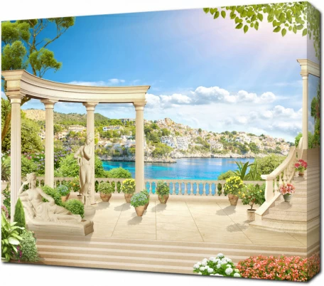 Картина на холсте Украшенная терраса с колоннами с видом на море