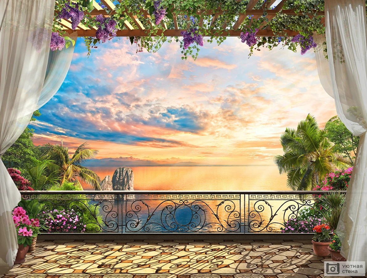 Дизайнерские фотообои Цветущий балкон с видом на океан