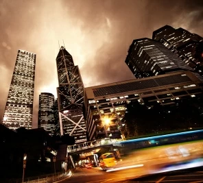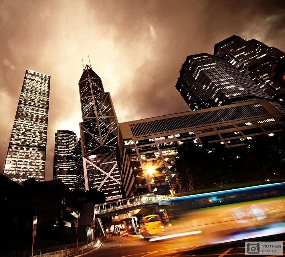 Фотообои Вид снизу на небоскребы ночного Гонконга