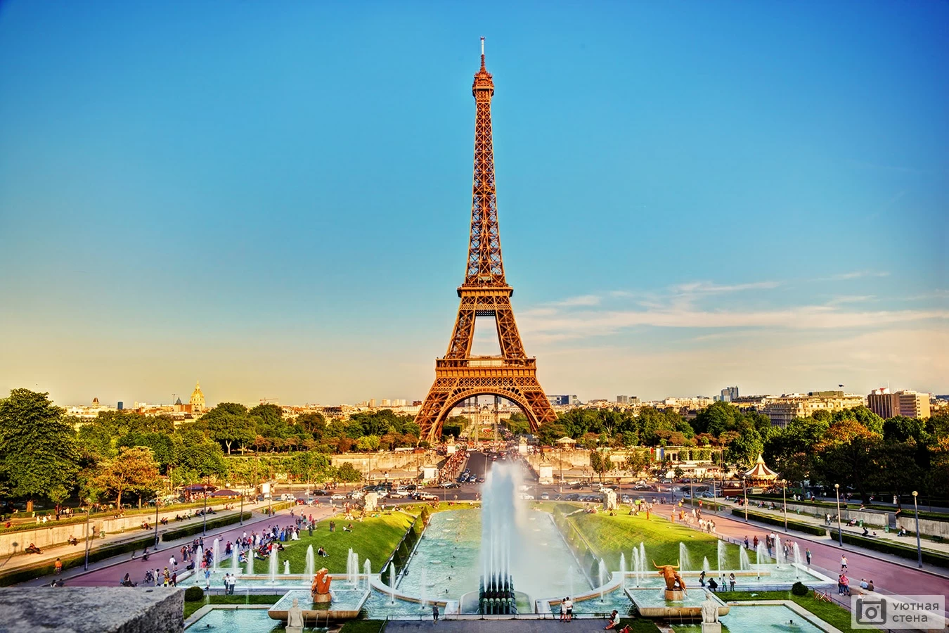 Фотообои Фонтан в саду Трокадеро с видом на Эйфелеву башню. Париж. Франция