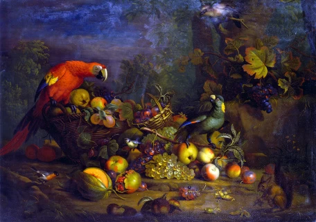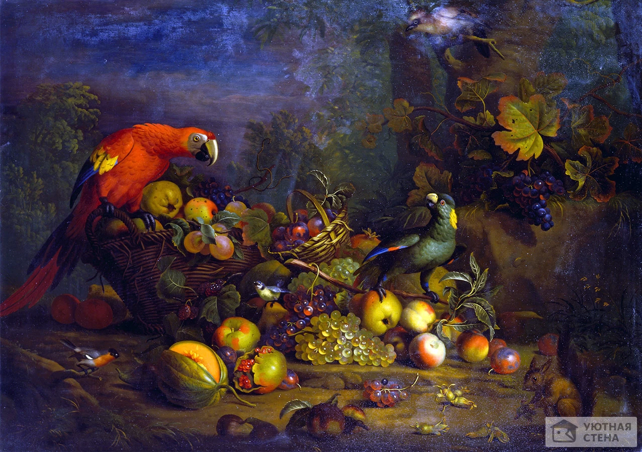 Фотообои Тобиас Страновер — Попугаи и фрукты с другими птицами и белкой