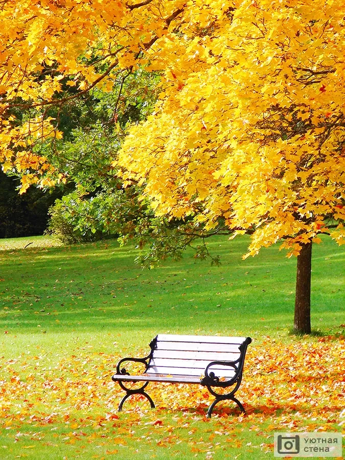 Фотообои Скамейка рядом с кленом в городском парке осенью