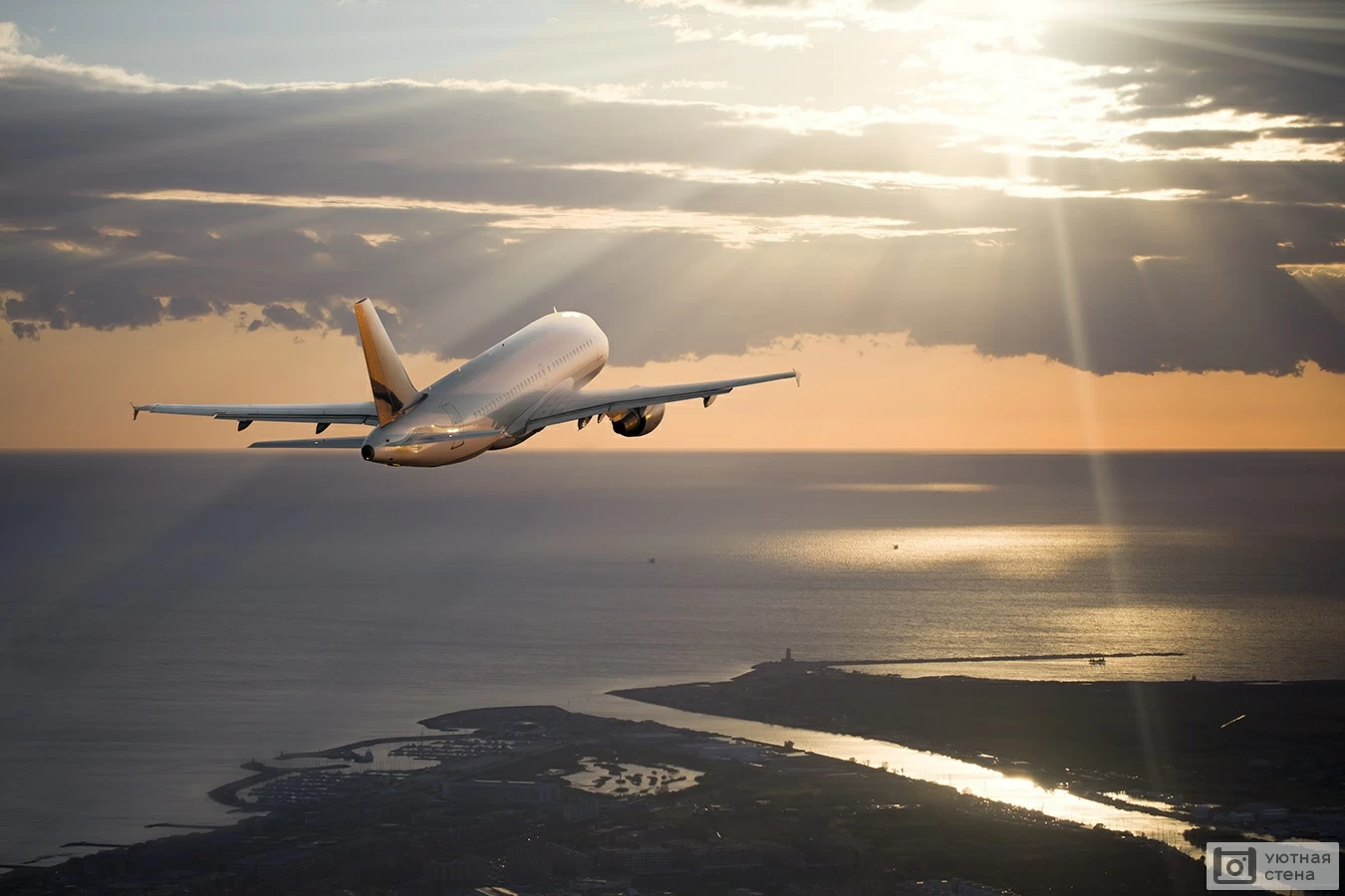 Фотообои Фото самолета, летящего над морем на закате