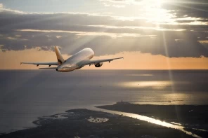 Фото самолета, летящего над морем на закате