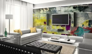 Подобрать в гостиную конкретный вариант можно, исходя из целостности задумки. Если это тематический стиль, тогда и отделку стен, потолка можно организовывать при помощи фотообоев с «говорящим» изображением. Могут встречаться варианты с красивыми надписями, просто хаотичными буквами, изящным рисунком, мега-крупными фотографиями одного или двух объектов.