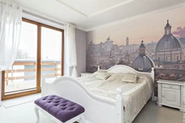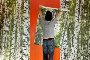 Хуже, когда интерьер выполнен с использованием виниловых или флизелиновых обоев, здесь могут возникнуть трудности. Если текстура отделки имеет рельефный орнамент не глубже 0,2–0,3 мм, заказывайте фотообои на флизелиновой основе с высокой плотностью. При глубине более 0,3 мм клеить изображение не рекомендуется. Проще снять старые обои и наклеить фото на предварительно выровненную поверхность стены.